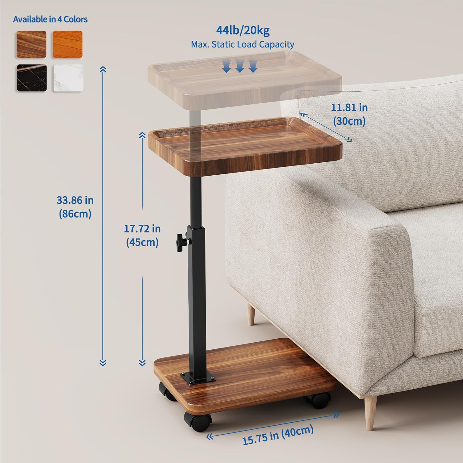 Adjustable Height Rolling Side Table with Walnut Finish and Anti-Roll Design