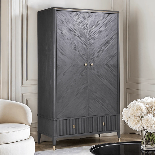 Functional Double Door Wardrobe Dark Wood Finish Wooden Slat Groove Drawers for Bedroom Use