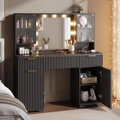Modern Bedroom Adjustable LED Vanity Desk with Storage Cabinets and Clear Glass Tabletop