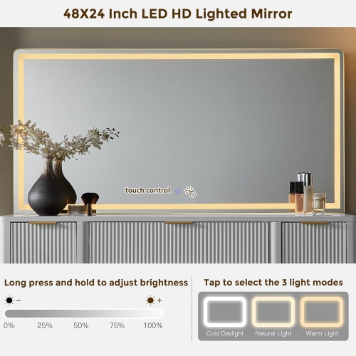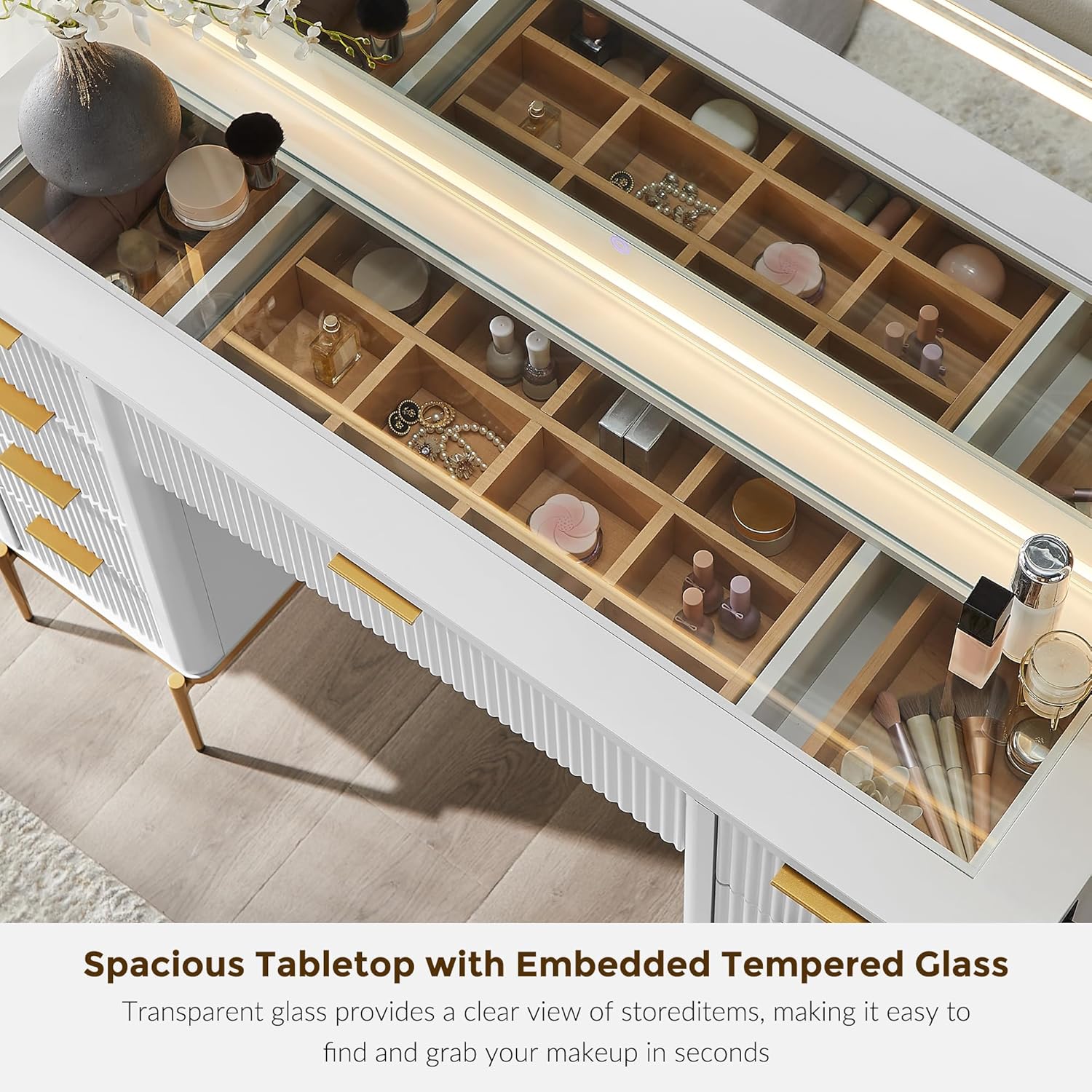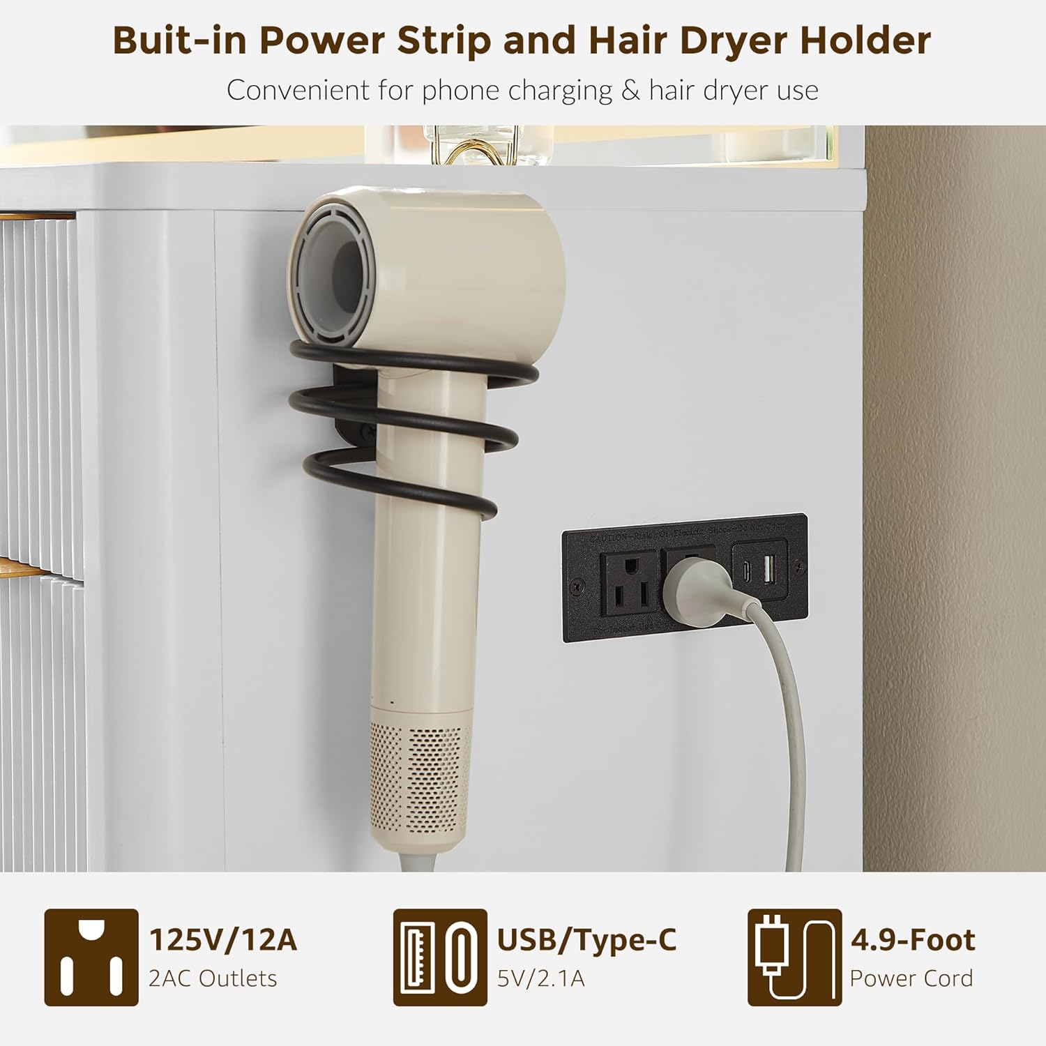 Modern Luxury Vanity Desk with LED Mirror 9 Drawer Makeup Table with Power Strip & Hair Dryer Holder